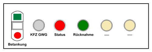 - Betankung starten, die Betankung wird durch kurzes drücken der Starttaste gestartet (siehe auch Status Start-Stoptaste), während des betankens muss aus Sicherheitsgründen innerhalb von 60 Sekunden nach dem letzten drücken der Starttaste diese erneut kurz betätigt werden. Wird dies unterlassen, so schaltet die Betankung automatisch ab!