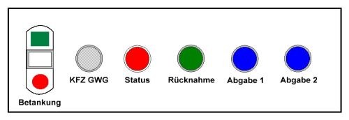 Blinkt Tankvorgang wurde durch betätigen der Starttaste eingeleitet, Ventile werden aufgefahren. Oder Tankvorgang wurde beendet Pumpen werden abgeschaltet und Ventile werden geschlossen. Zapfschläuche dürfen nur an- oder abgekoppelt werden wenn das Signal aus ist.